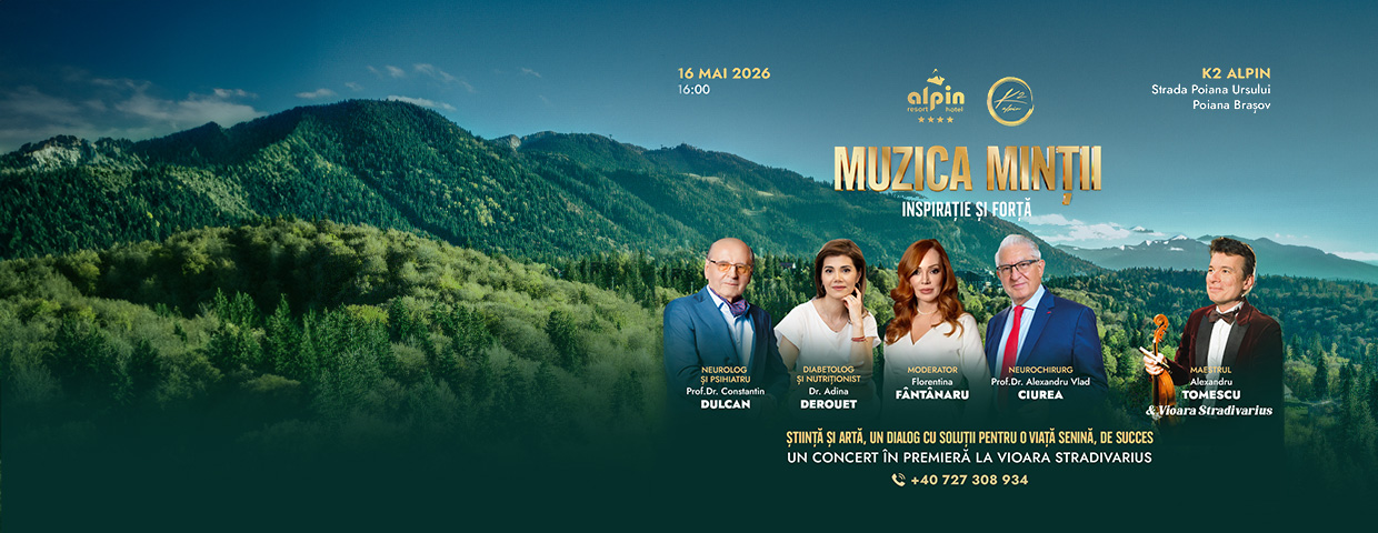 Sâmbătă, 16 mai 2026, de la ora 16:00, K2 Alpin, Poiana Brașov, găzduiește Conferința-Eveniment MUZICA MINȚII – Inspirație și Forță, un nou format ce îmbină știința- spiritualitatea-arta și care îi aduce în fața publicului pe unii dintre cei mai reputați specialiști din România: